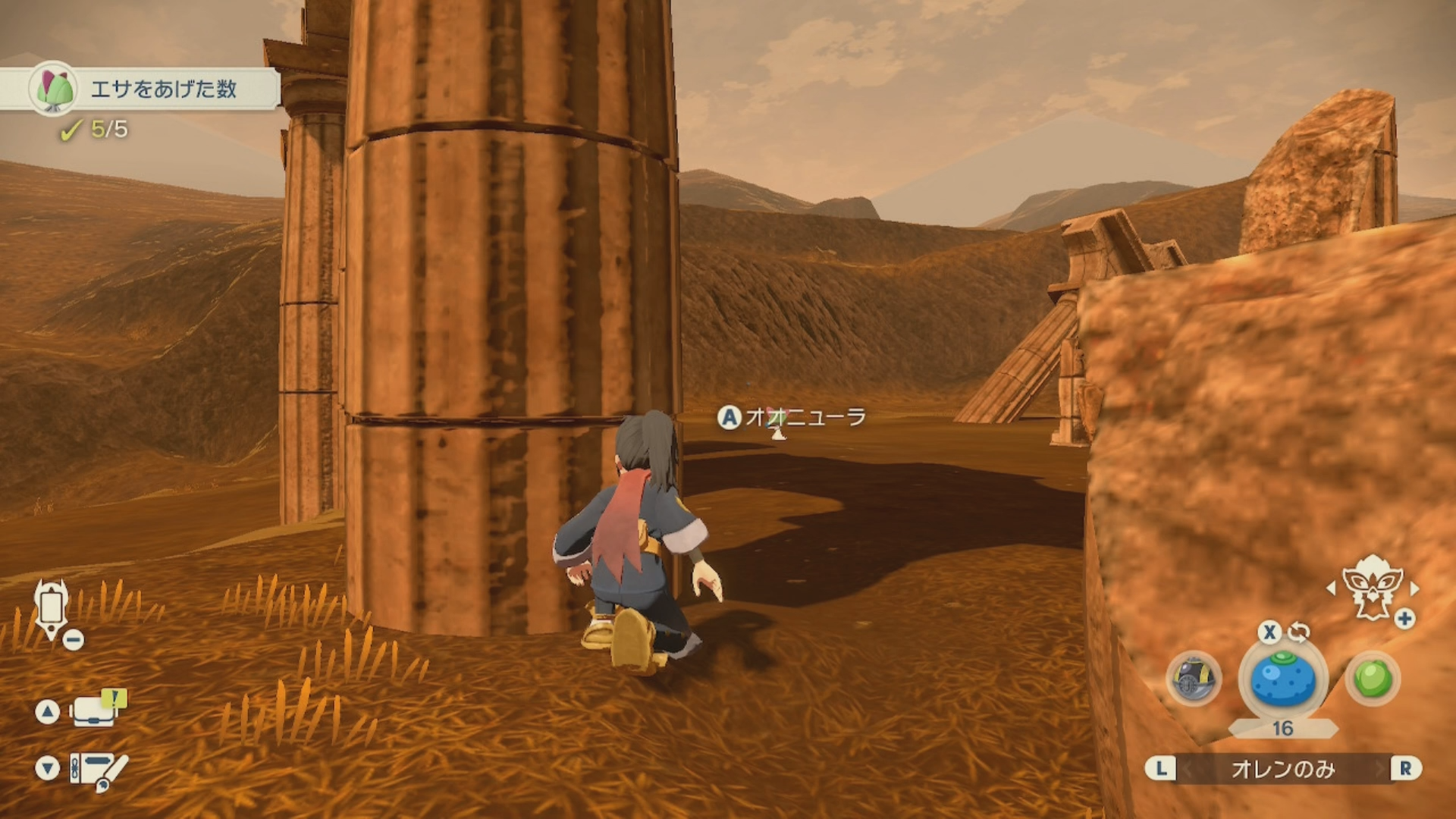 豪快に駆け寄っていくと、行動ムックル型なのですぐ逃げます。うまくボールを当てれば背面取りもできるのですが、“みつからず”タスクもあるので、やはり草むらや壁に隠れてボールを当てましょう。