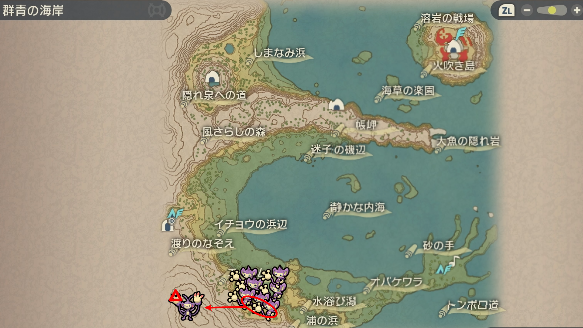 揺れていれば間違いなくエイパムなのですが、そもそも揺れる確率はそんな高くないので、群青の海岸に来る度に確認してみましょう。