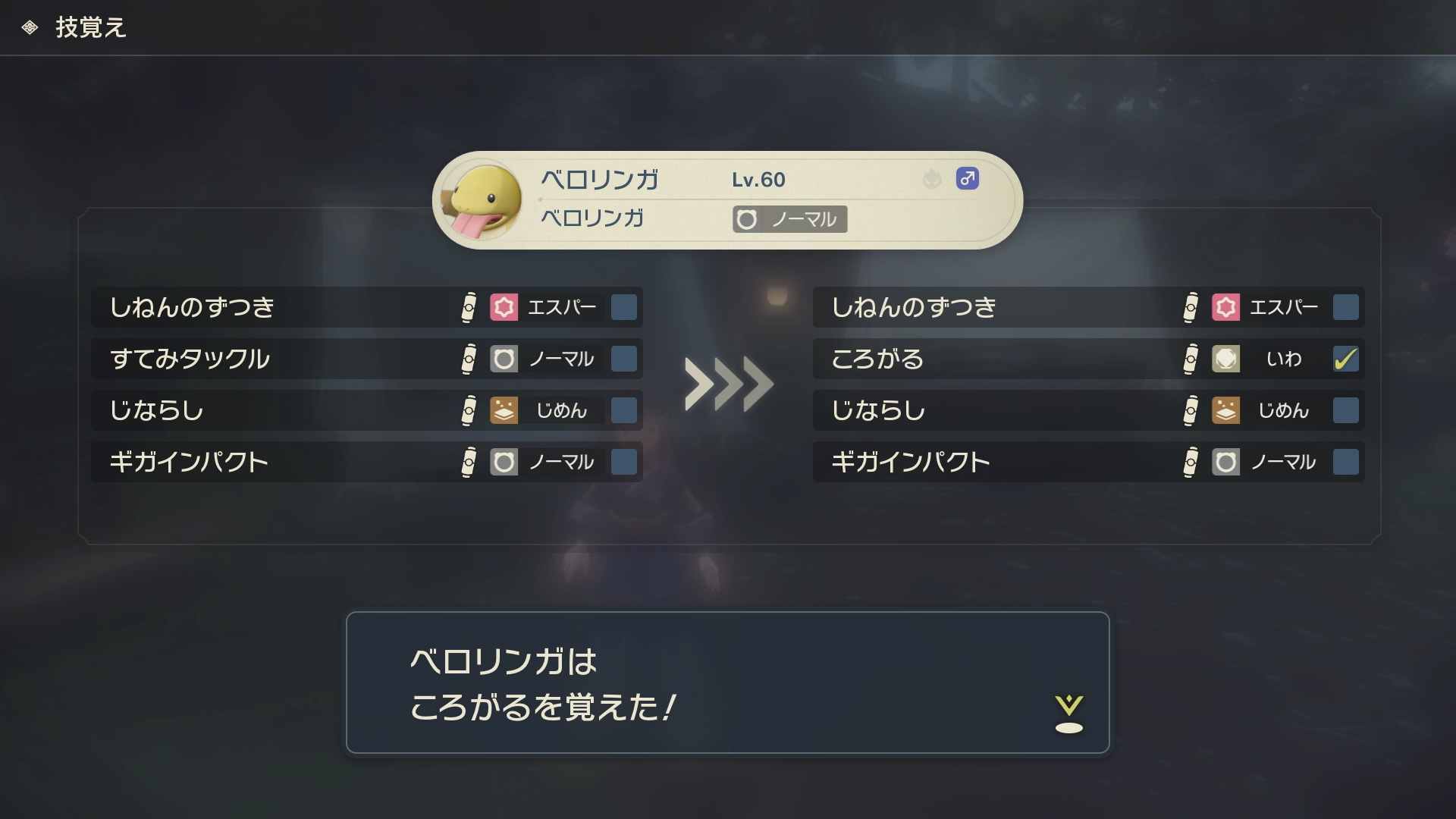 ベロリンガからベロベルトへはレベル34で覚える『ころがる』を技欄に覚えさせると進化可能状態になります。