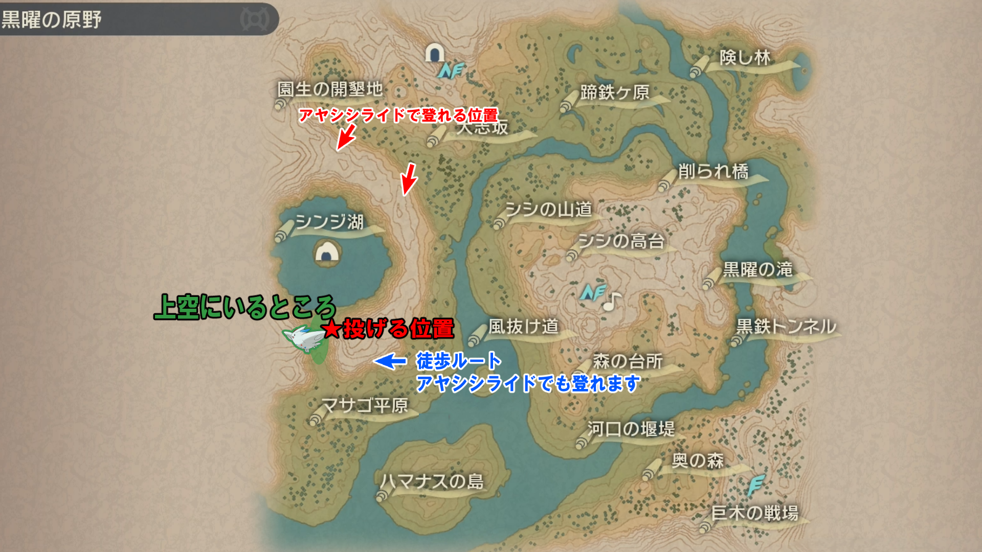 ムクバードレベル40オーバーを倒せるレベルなら真ん中を突っ切って、難しいなら左右から周り道をして投げる位置を目指しましょう。