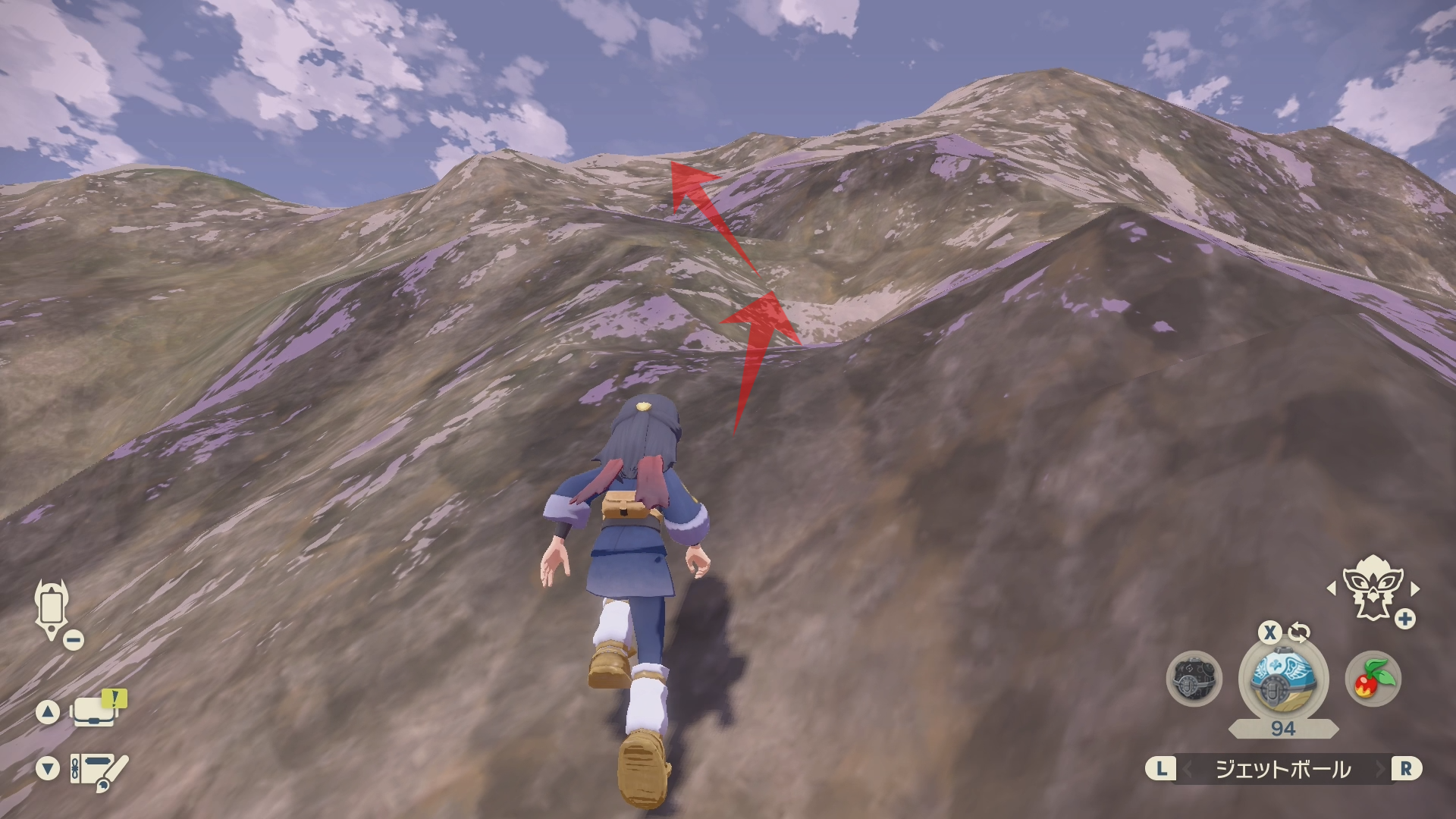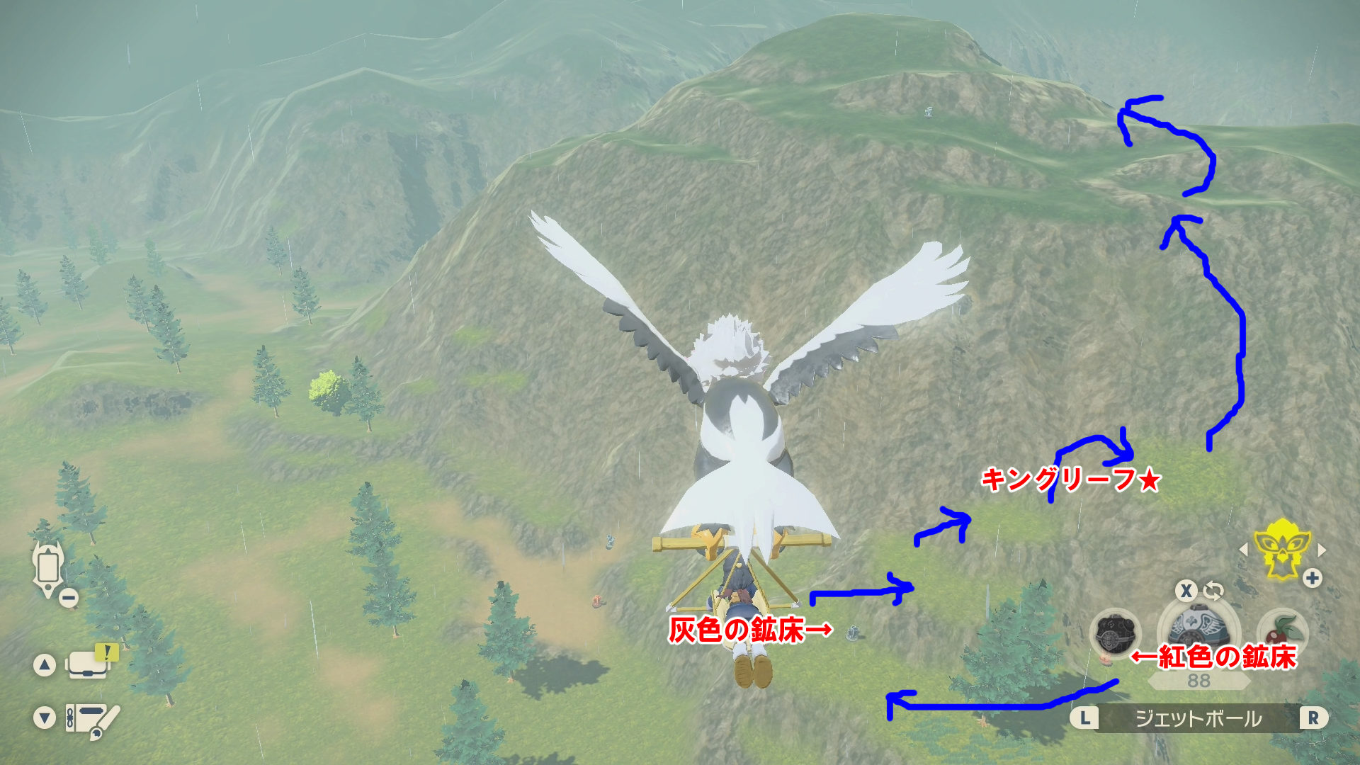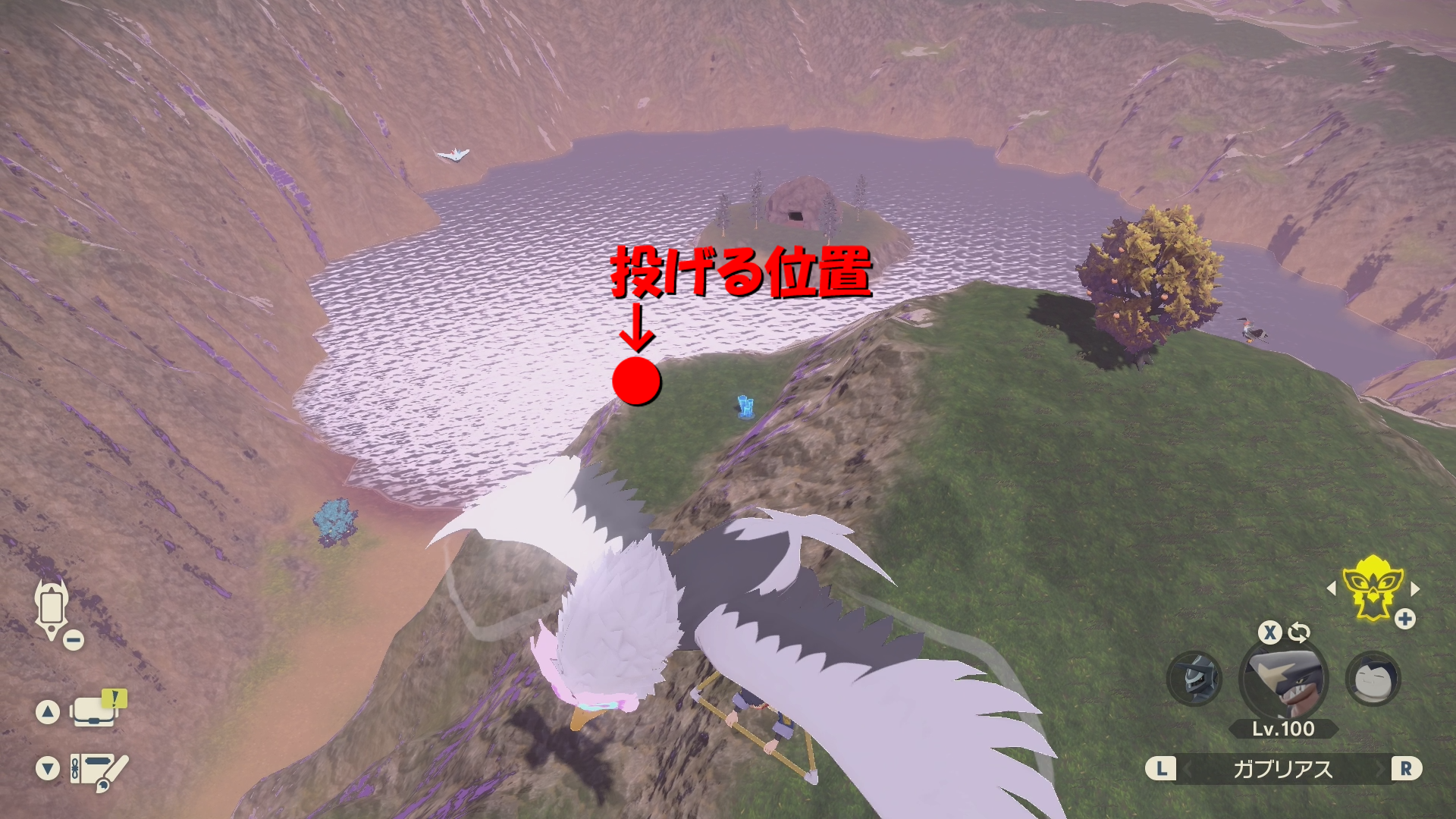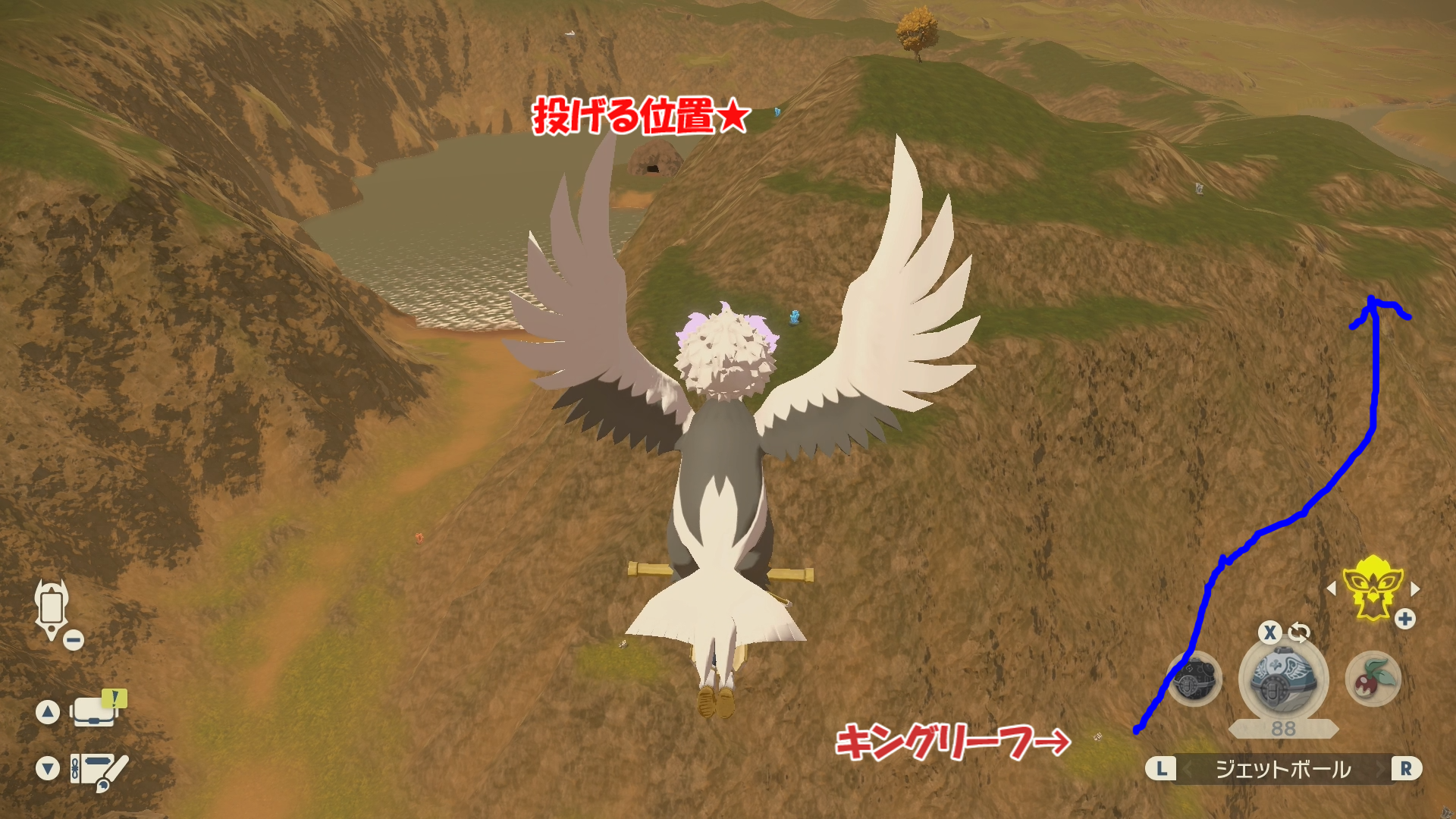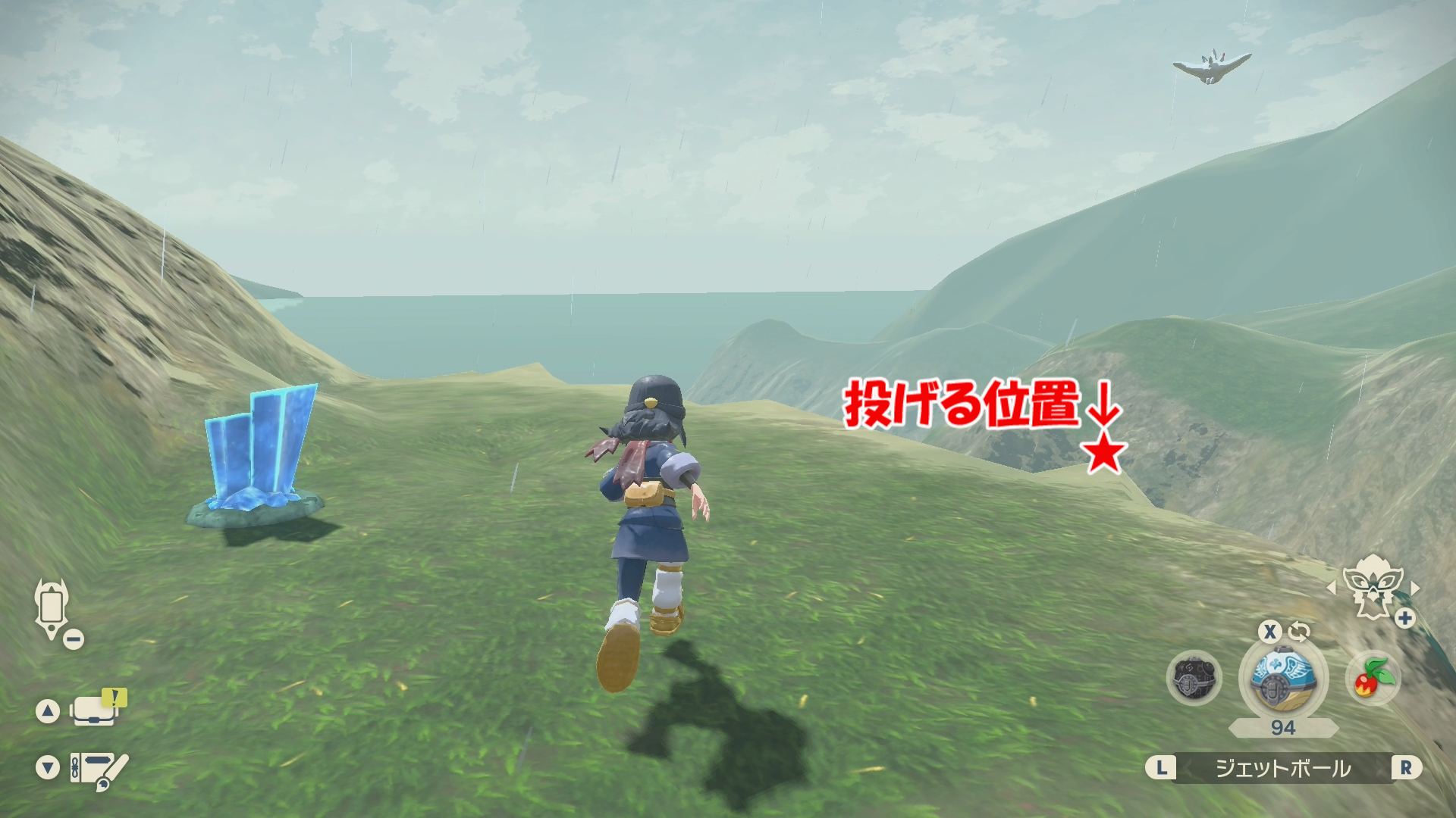 トゲキッスからみてそらいろの鉱床の正面の方の尖った崖から投げましょう。