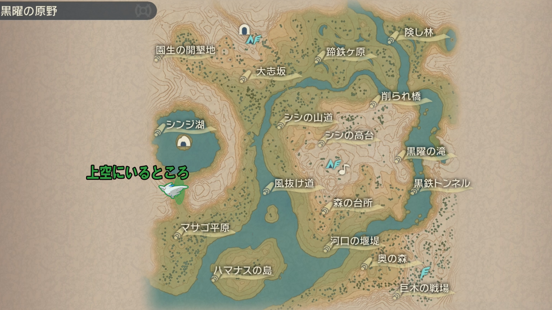 黒曜の原野、マサゴ平原からシンジ湖に続く道の上空を飛んでいるのが確認できます。