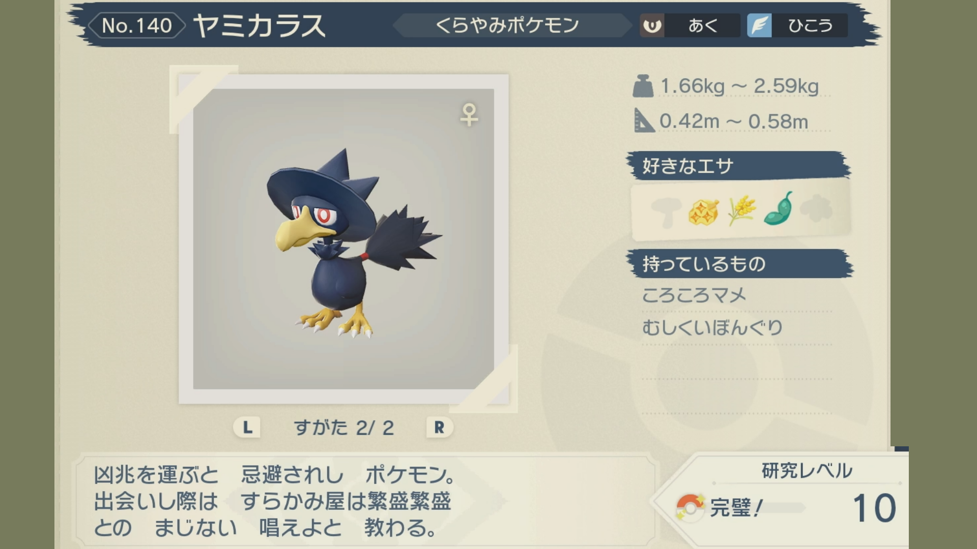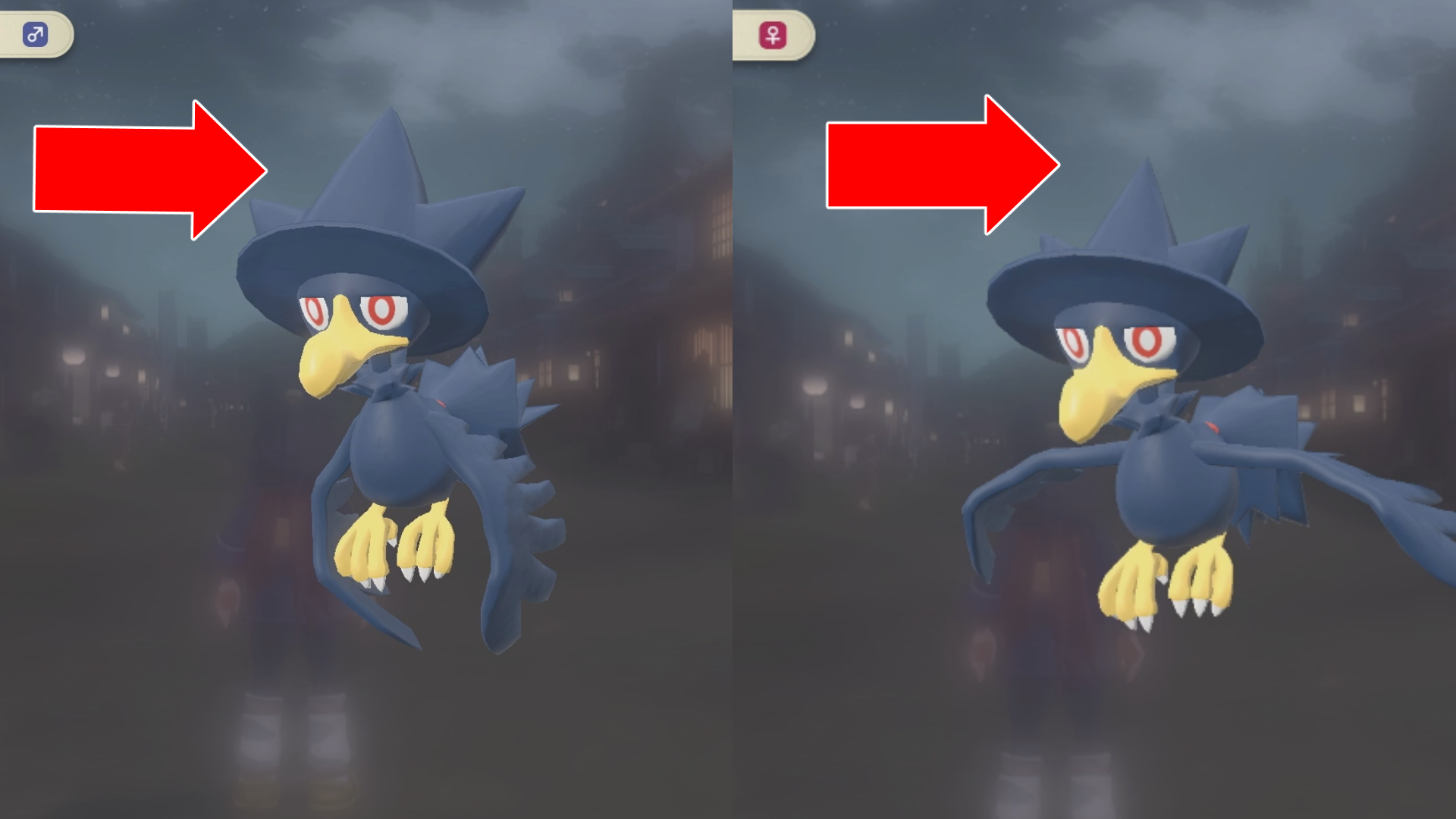 ヤミカラスのオスメス違いは帽子に見えるトサカの大きさで、オスの方が大きく描かれていますね。