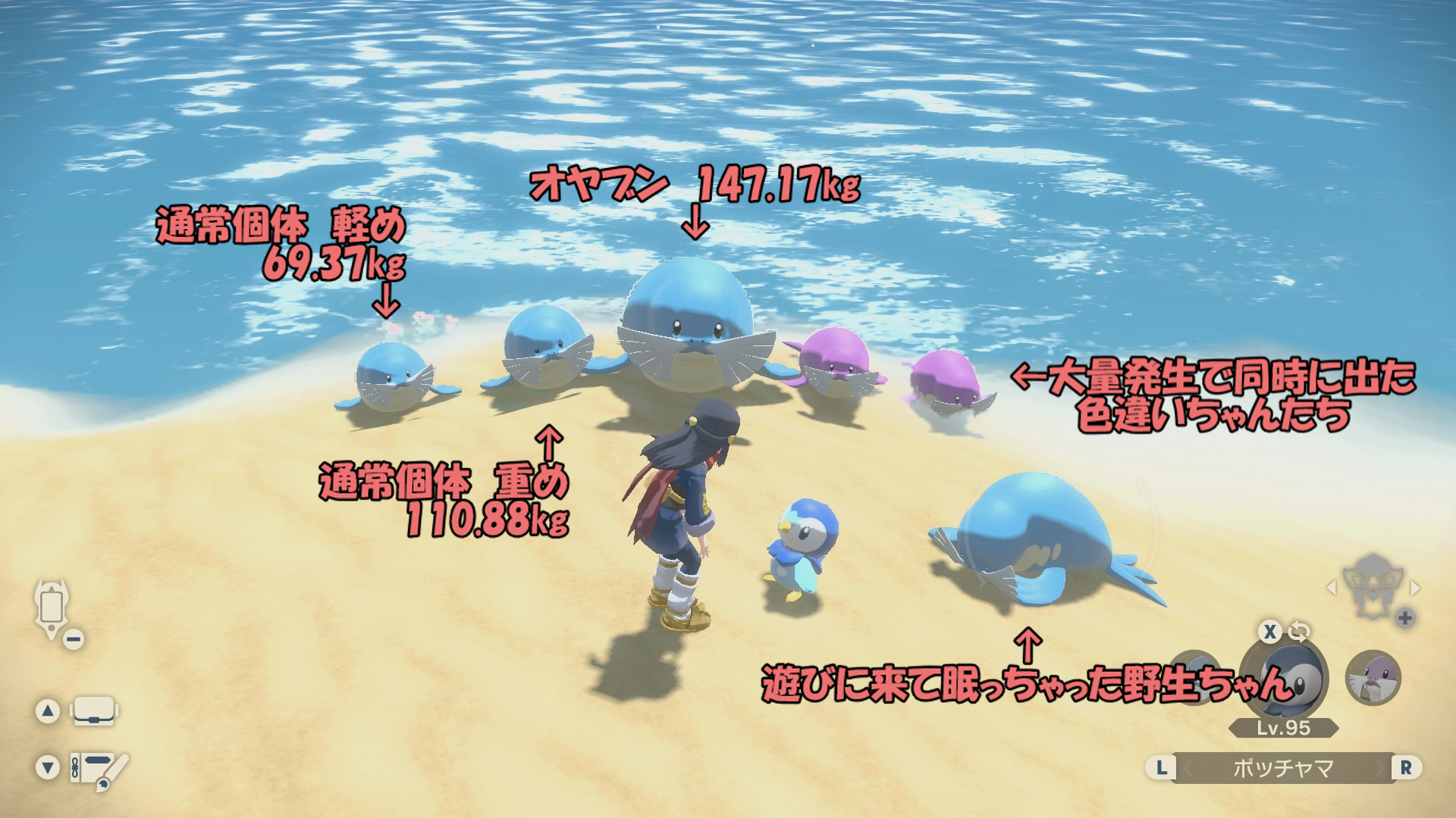 しまなみ浜では進化先のトドゼルガと、浦の浜では進化前のタマザラシと出現枠が同じなので、出現数は振れ幅があります。