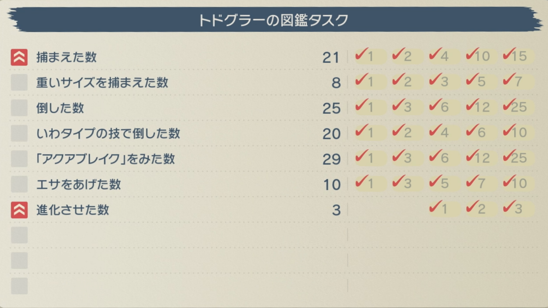タマザラシの図鑑タスクをこなしていれば図鑑コンプ上ではトドグラーを進化させる必要はありません。