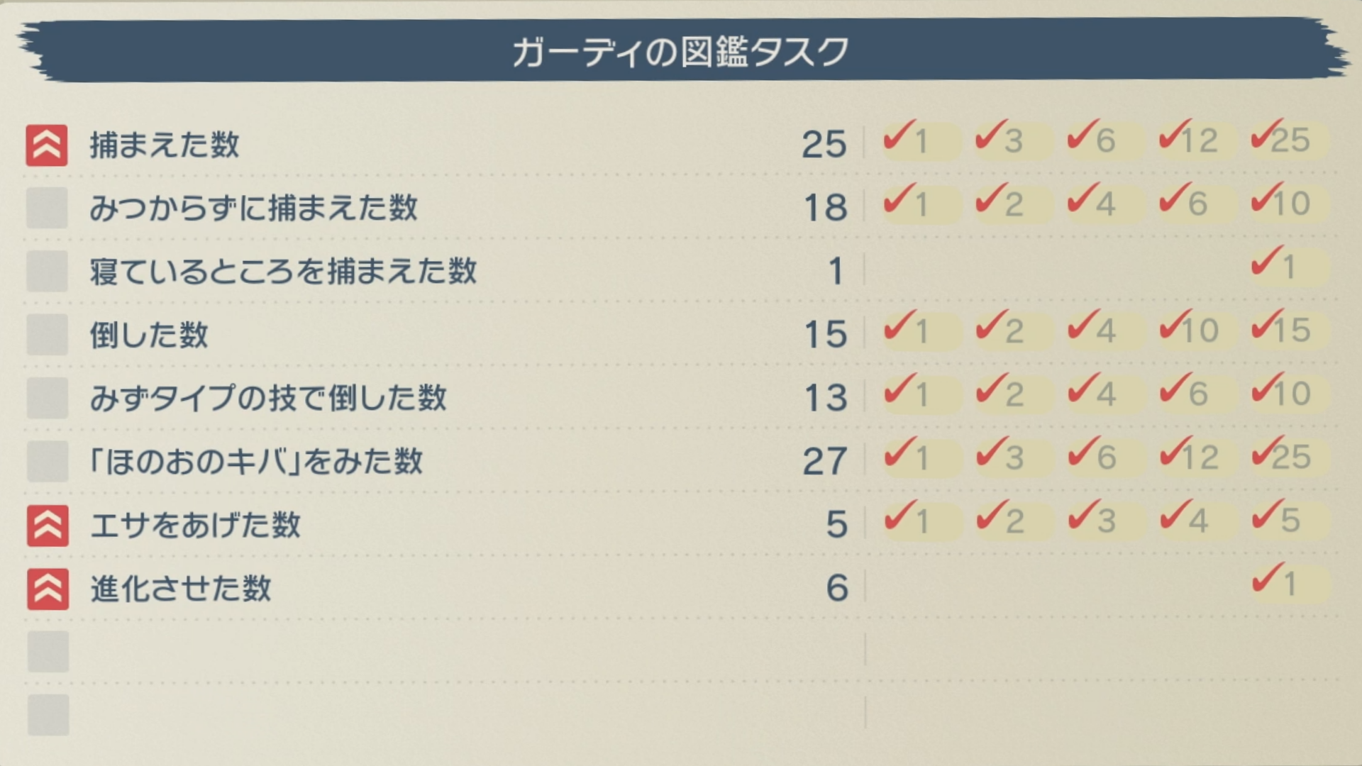 図鑑タスク上は進化は1回分で済みますが、ウインディの入手方法が進化のみなので5匹進化用に確保しておきましょう。