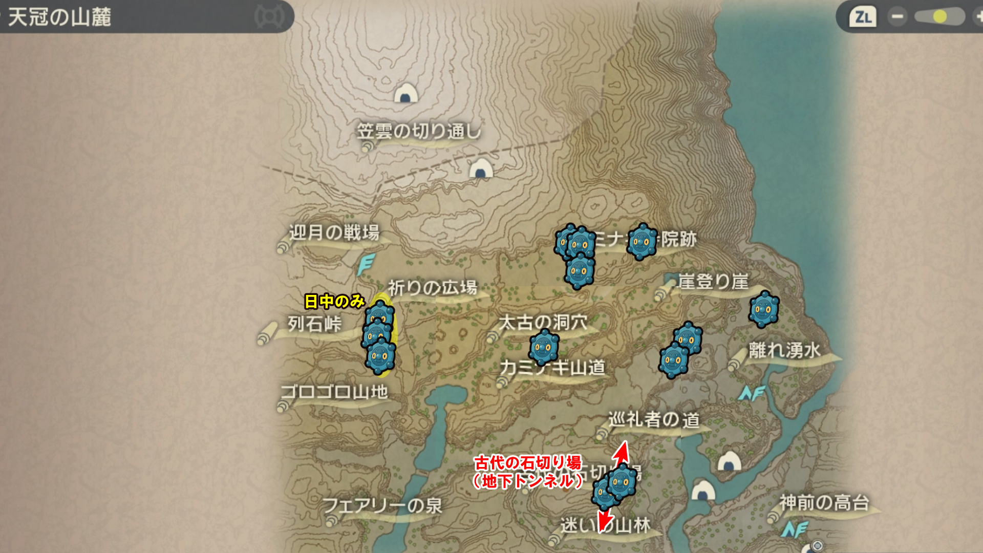 天冠の山麓のみですが、割と広範囲に確定出現するので、図鑑タスクでウロウロしていれば自然と達成していると思います。