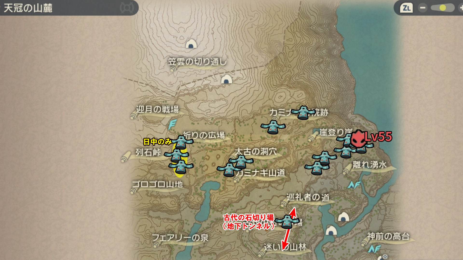 崖登り崖と離れ湧水の間の窪地でオヤブンが確定で出現します。