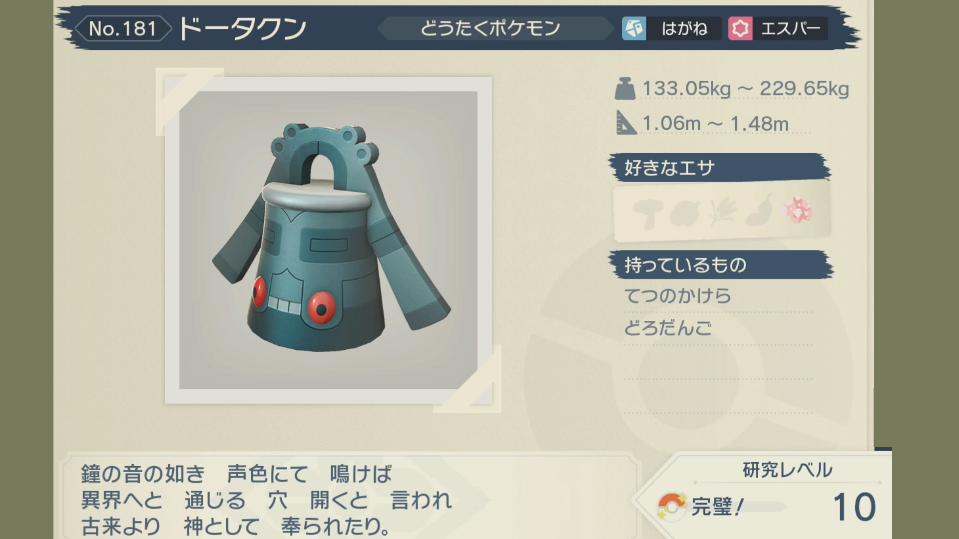 キッサキ神殿の前(湖側)と神殿内部1階に出現しますがドーミラーと出現枠が同じで、ドータクンの方が優先度高めです。