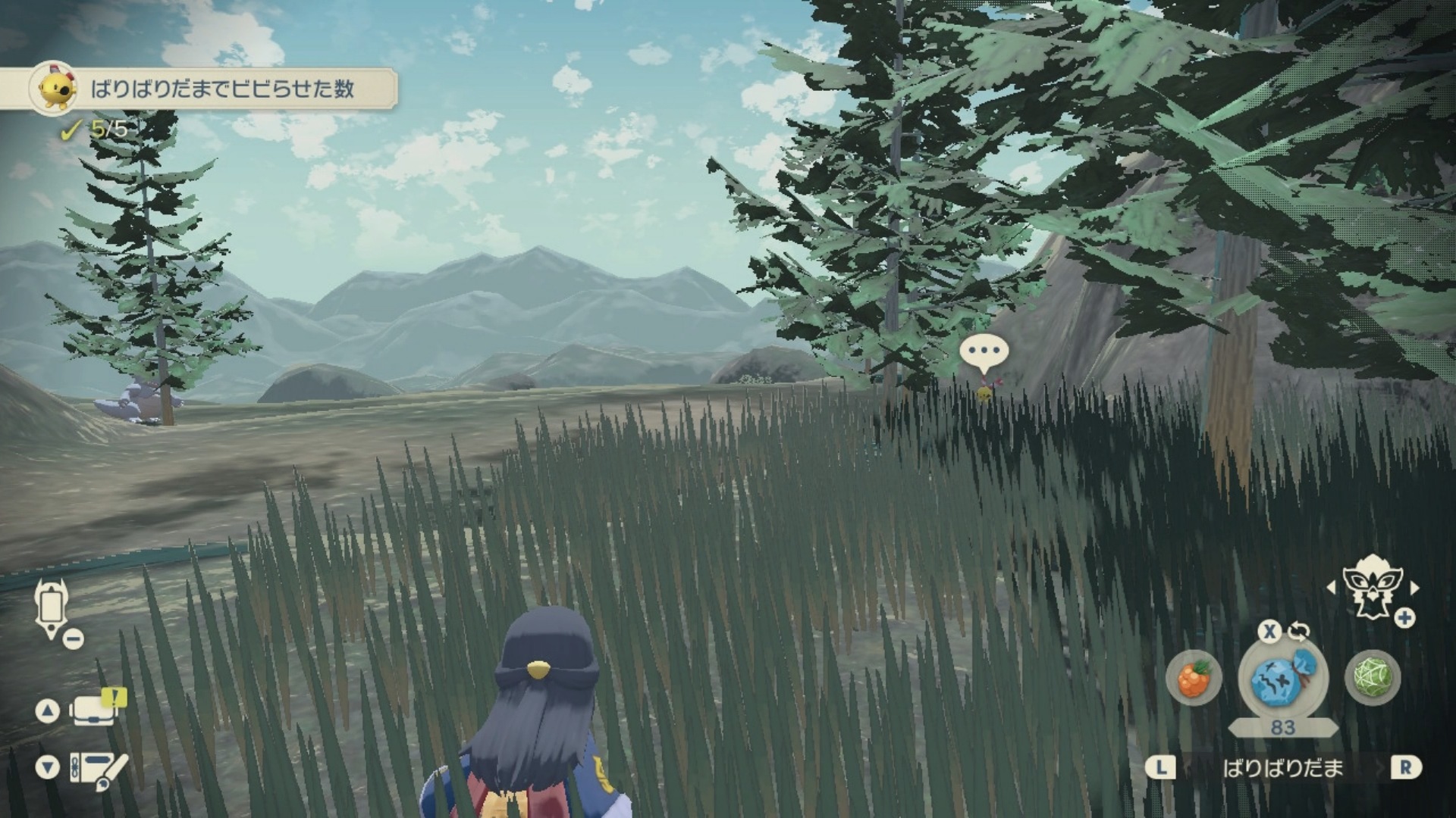 相手に気付かれていない状況で「ばりばりだま」を投げるとポケモンがビックリしてその場を離れます。通常時は集団でいるときに、その群れを散らして集団に襲われないように使用します。