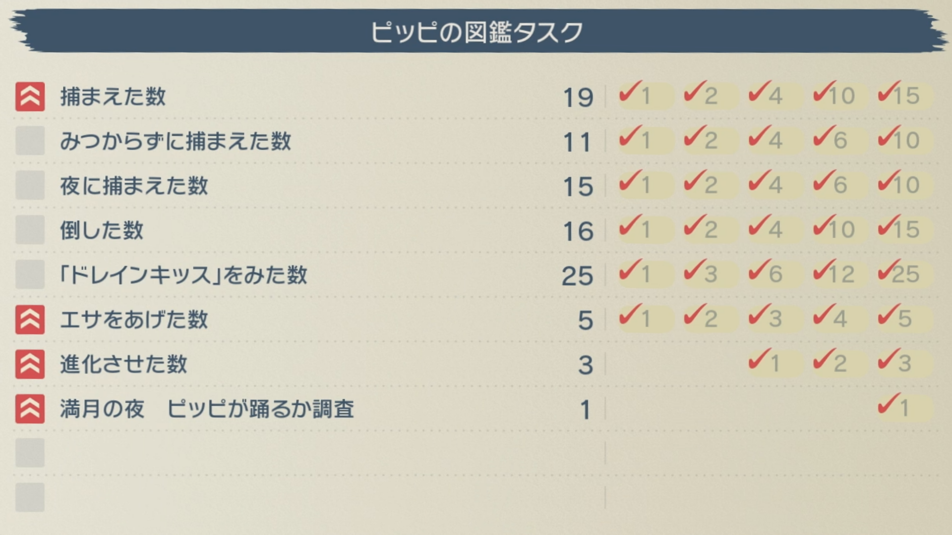 図鑑タスクは進化前のピィをかなり簡単にしたもので、サブ任務も絡んできて、満月を狙うのがやや面倒なくらいですが、出現数も一族の中では一番多く、楽な方です。