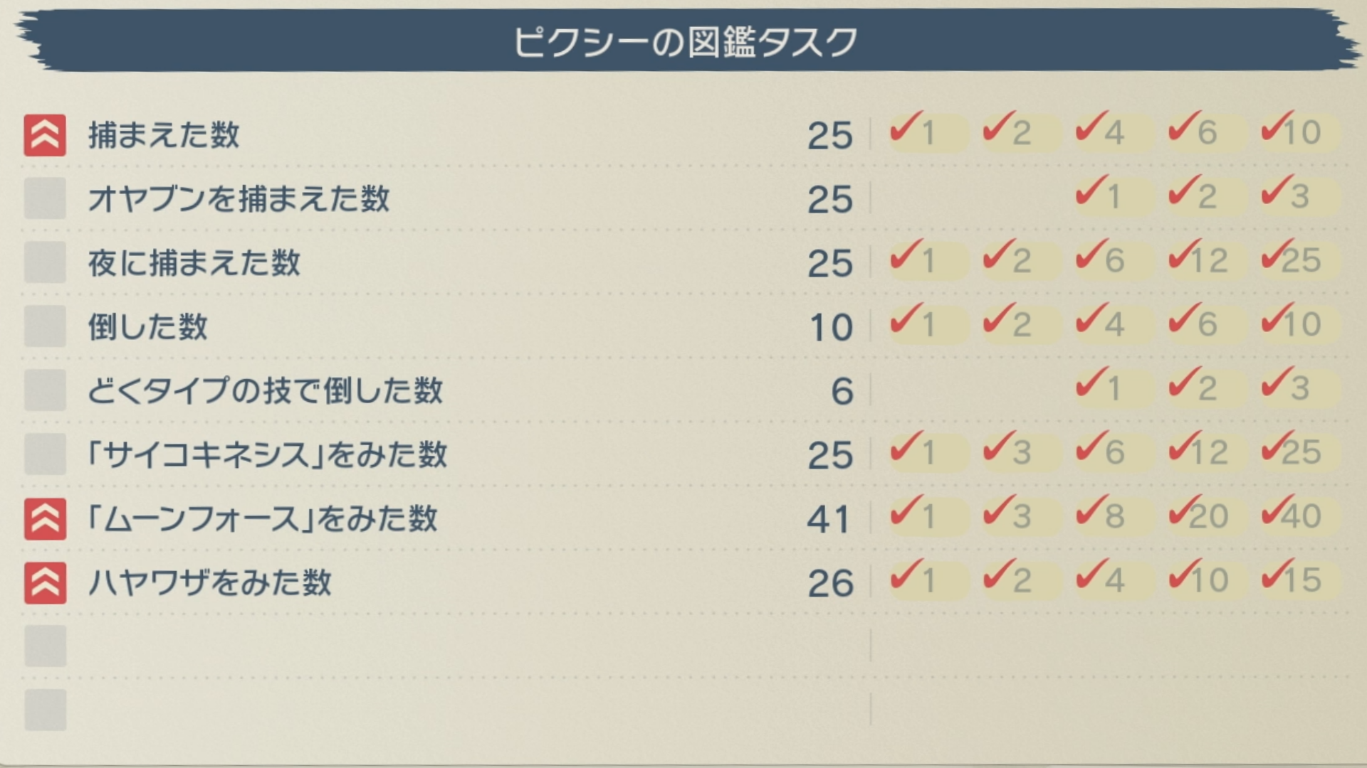 ピッピに「つきのいし」を使って進化させても加算されます。“オヤブンを”、“夜に”タスクがあります。