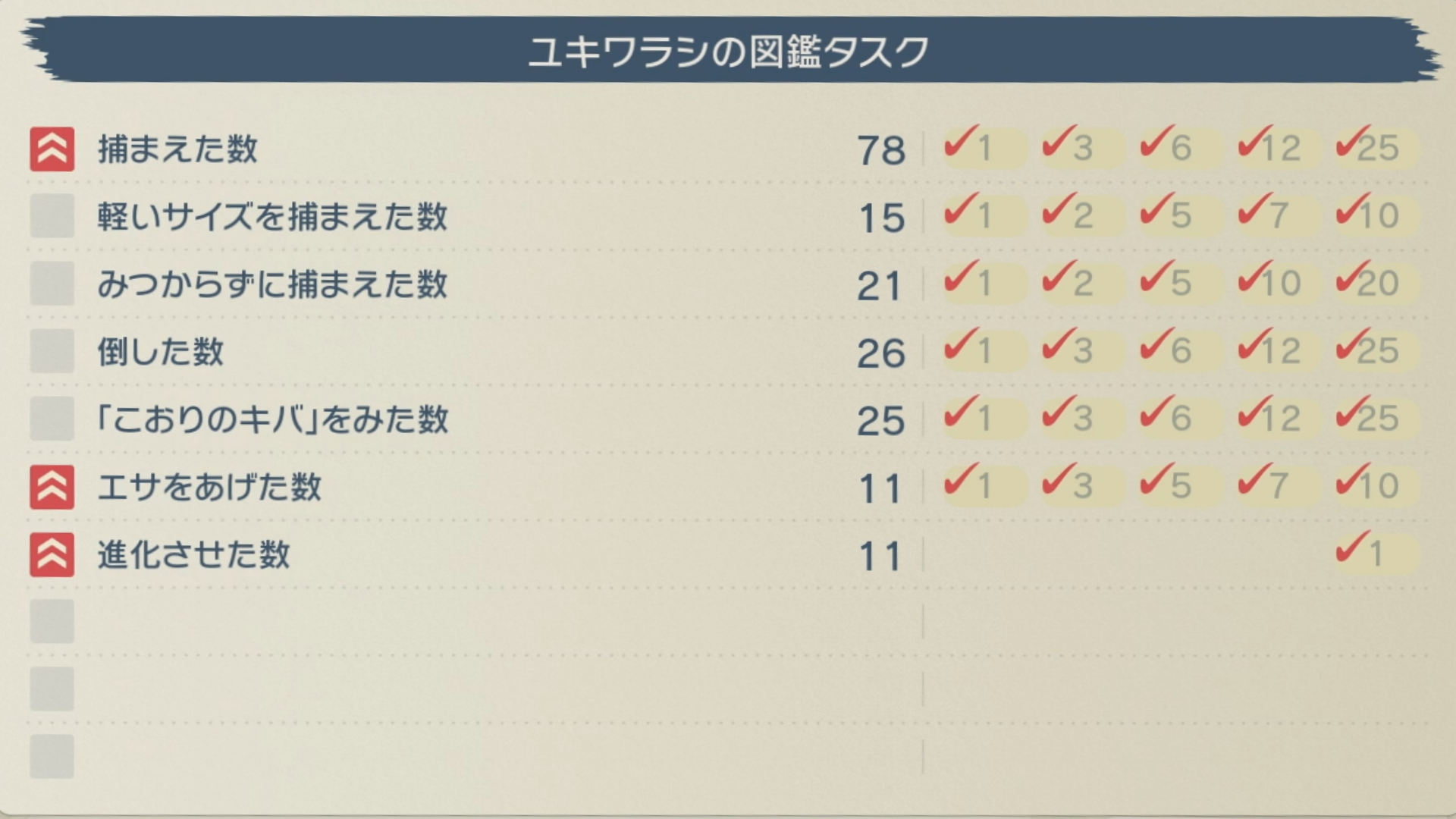 捕まえた数 1/3/6/12/25