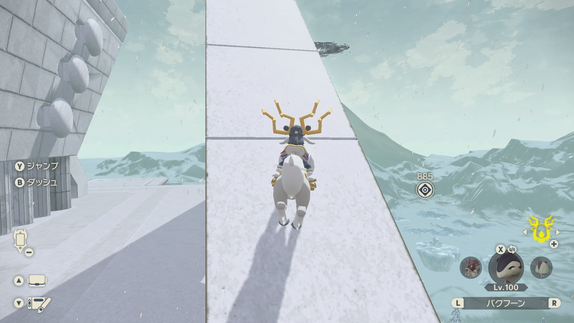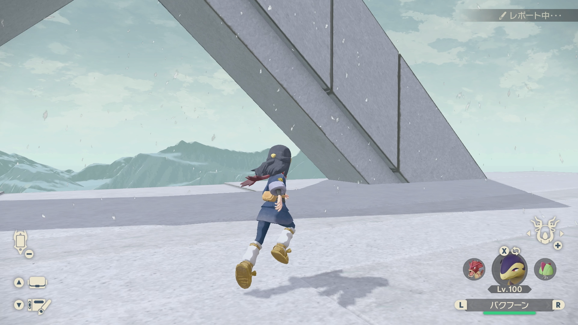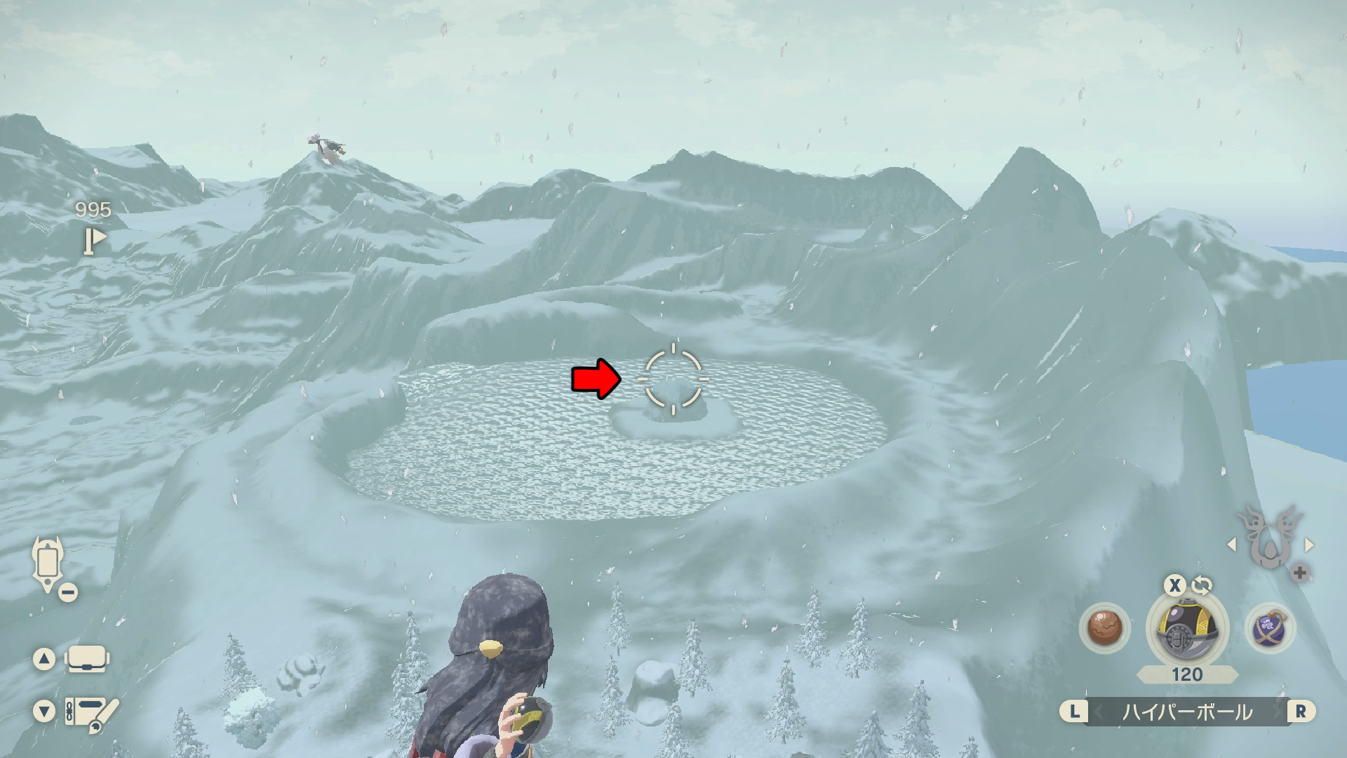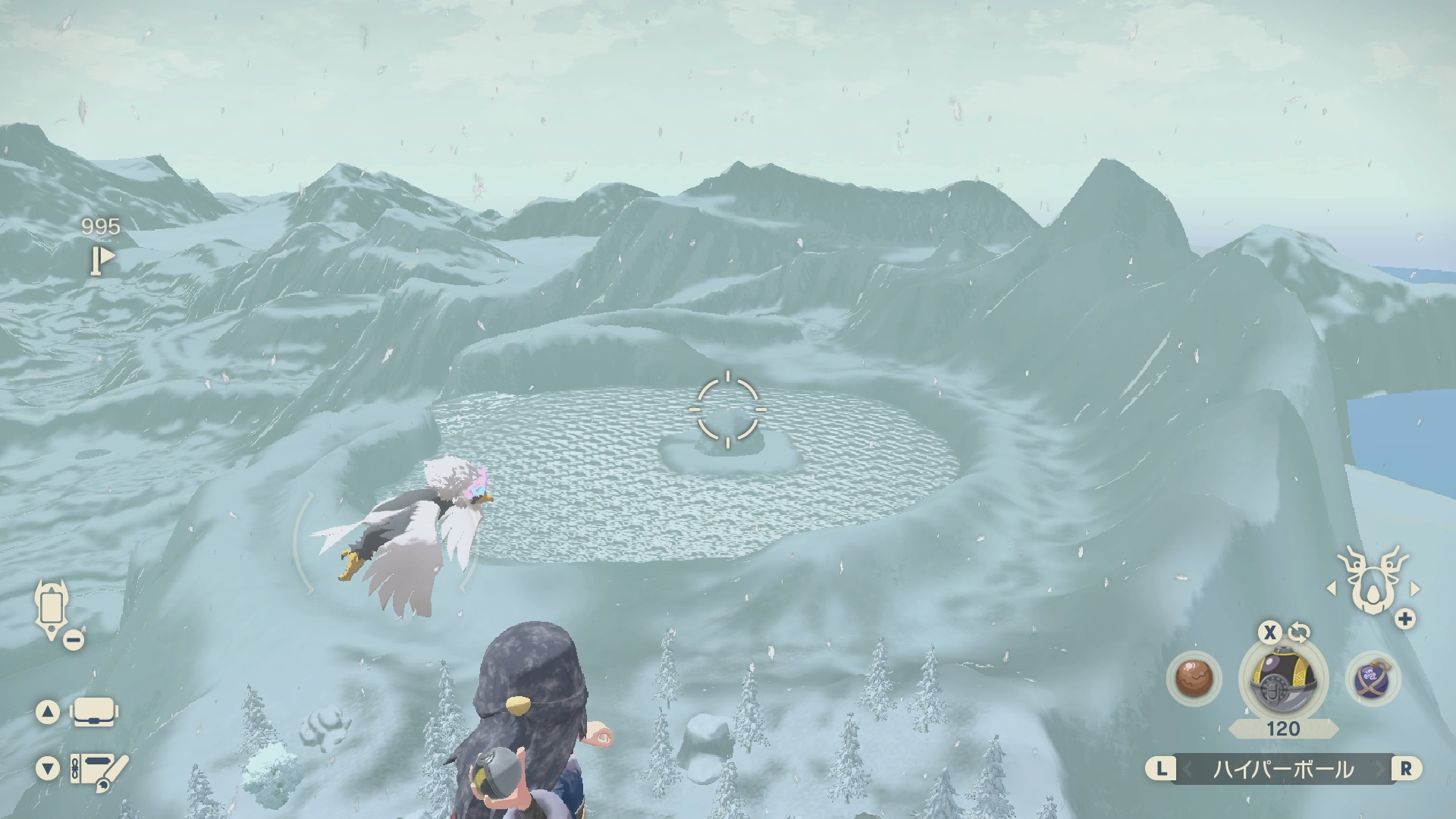 純白の凍土でエイチ湖とキッサキ神殿の間を飛んでいるのが確認できます。