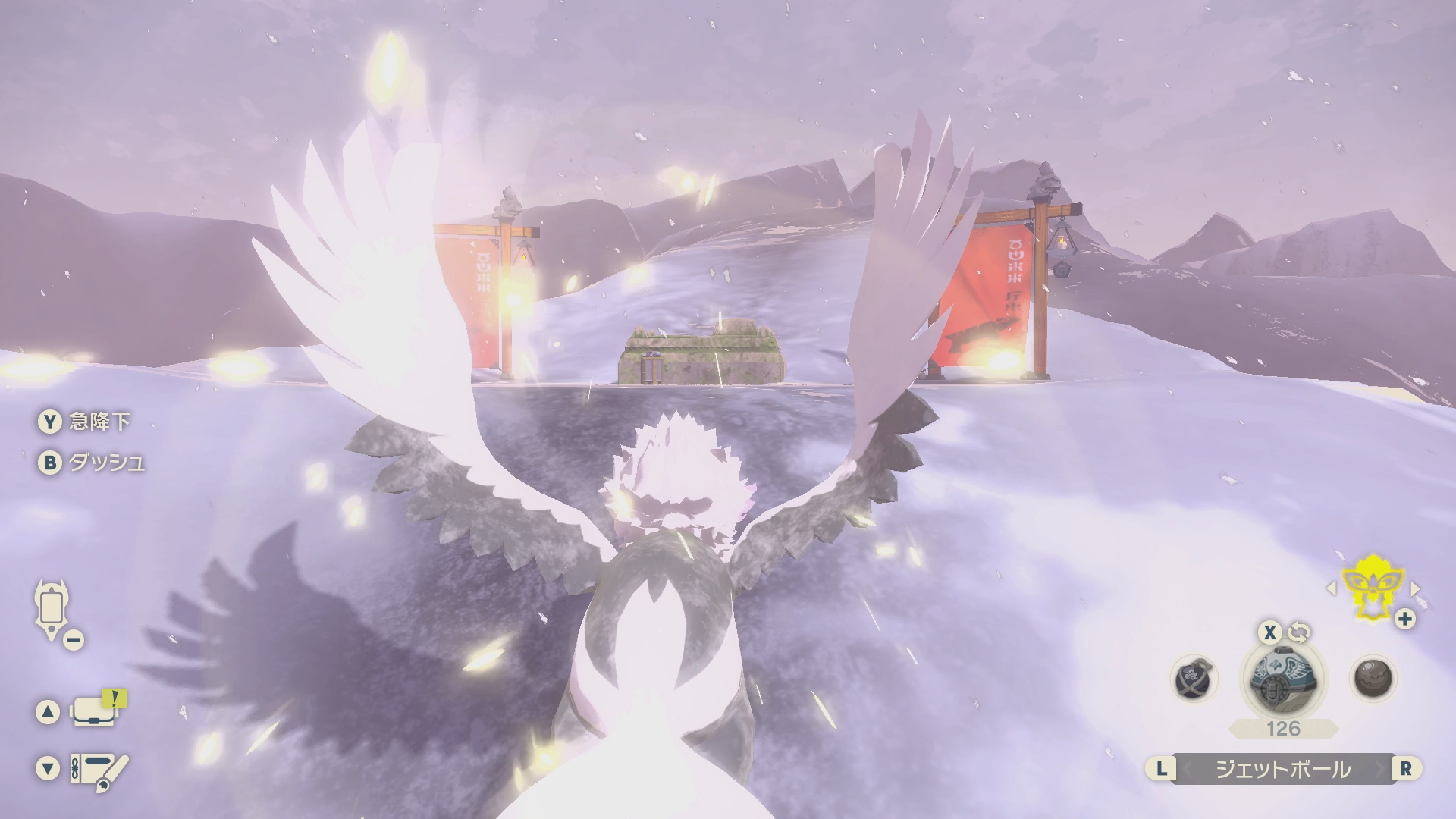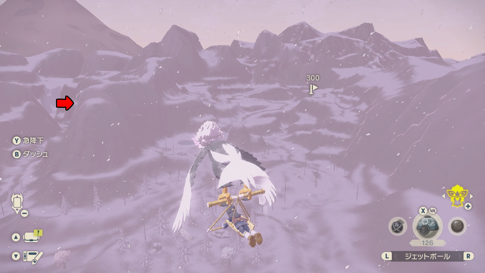 くるっと、南の方に旋回し矢印の足場をダッシュで目指します。