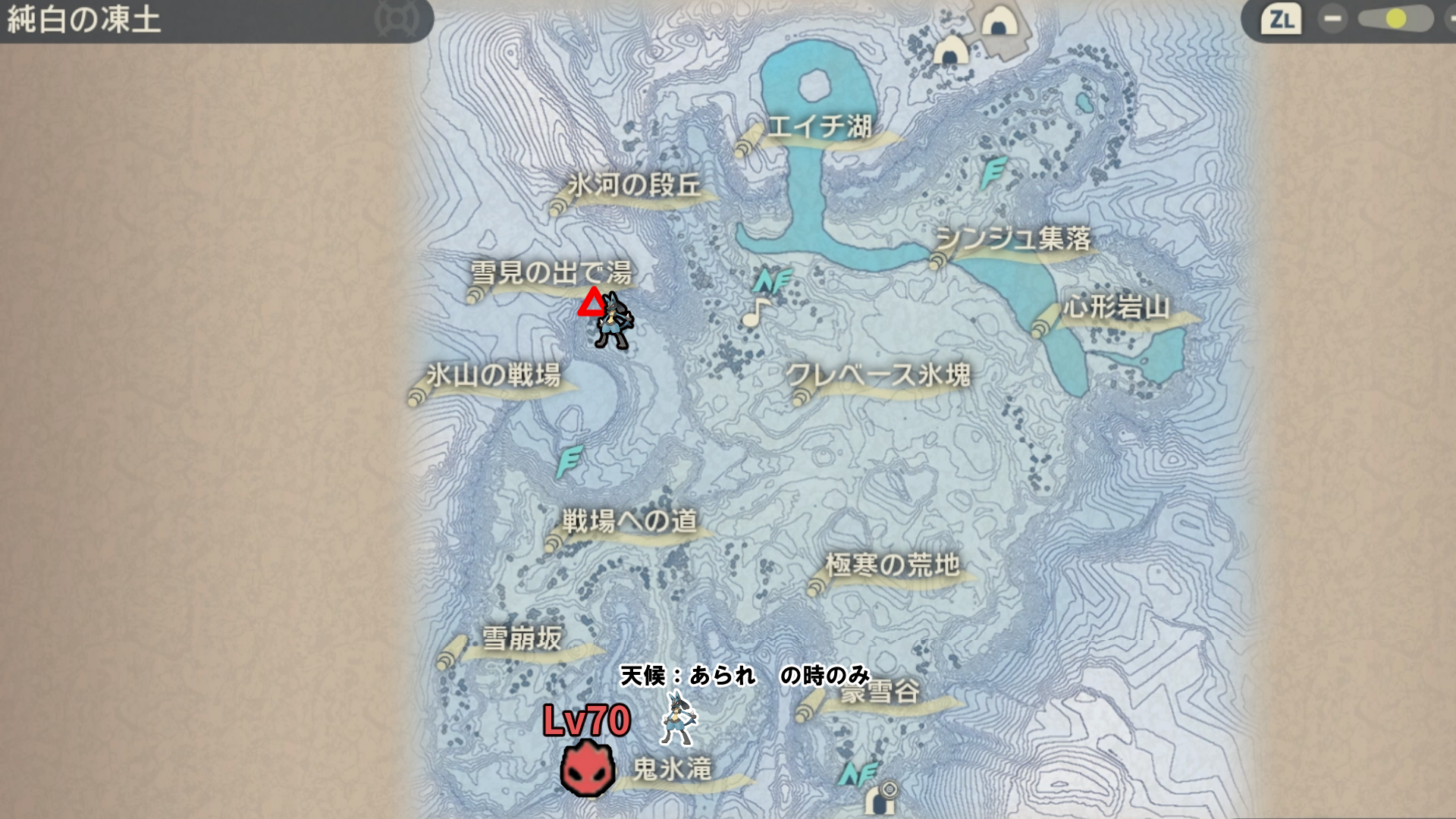 オヤブン、もしくは天候があられの時に急いで鬼氷滝に行って捕獲していきましょう。