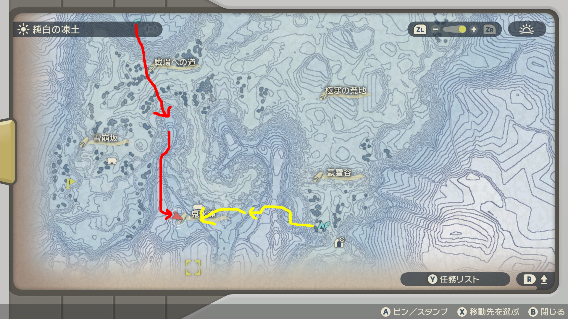 立地的に、ベースから真西にオオニューラを使って強引に突破してもたどり着きますが(黄色線)、わかりやすいルート(赤線)をご紹介します。