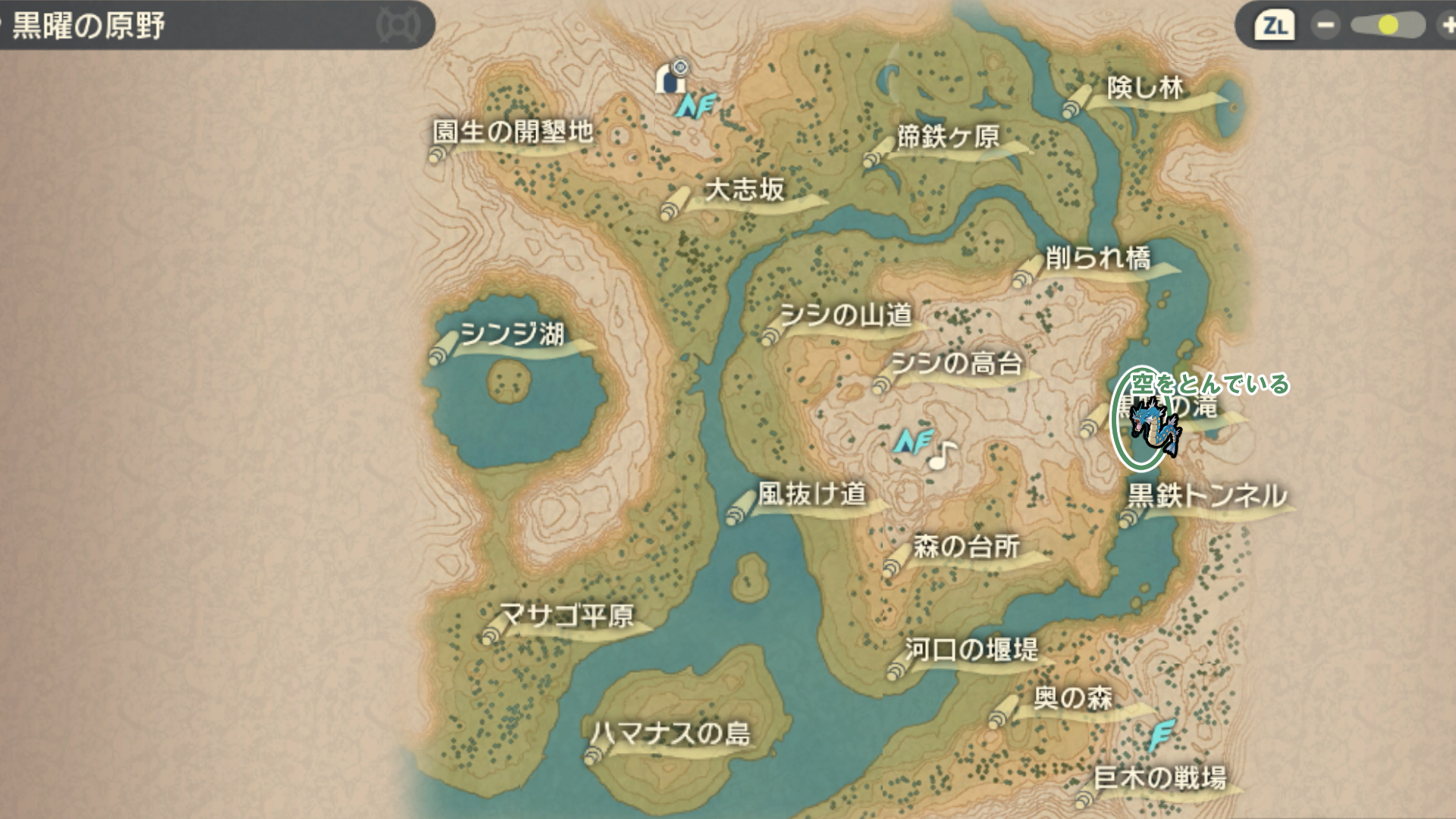 徒歩かアヤシシライド(あればウォーグルライド)でゲンキノツボミの付近に来たら滝寄りの崖(〇印の場所)へ行きます。